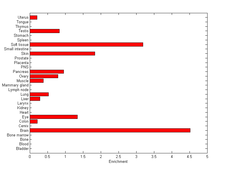 The expression level is normalized with tissue-library size. Each value for a gene in a tissue is a ratio of observed ESTs to the expected one in this tissue. The expected number of ESTs is the product of total ESTs of the gene and the fraction of total ESTs in the tissue among all ESTs in 30 tissues.