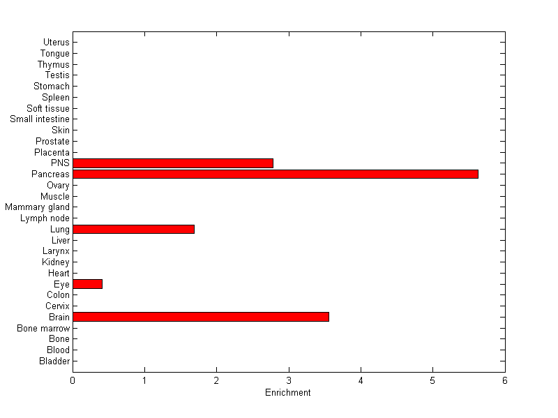 The expression level is normalized with tissue-library size. Each value for a gene in a tissue is a ratio of observed ESTs to the expected one in this tissue. The expected number of ESTs is the product of total ESTs of the gene and the fraction of total ESTs in the tissue among all ESTs in 30 tissues.