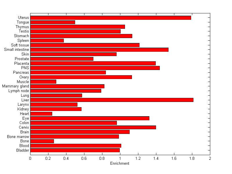 The expression level is normalized with tissue-library size. Each value for a gene in a tissue is a ratio of observed ESTs to the expected one in this tissue. The expected number of ESTs is the product of total ESTs of the gene and the fraction of total ESTs in the tissue among all ESTs in 30 tissues.