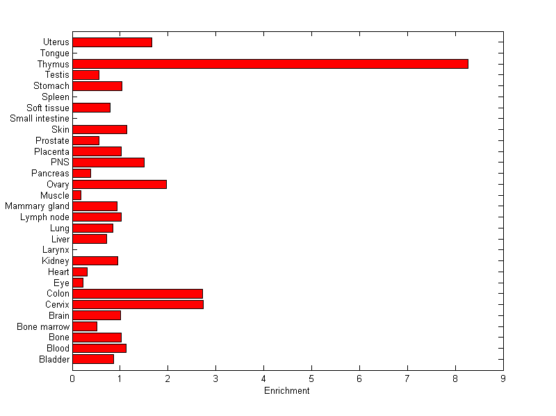 The expression level is normalized with tissue-library size. Each value for a gene in a tissue is a ratio of observed ESTs to the expected one in this tissue. The expected number of ESTs is the product of total ESTs of the gene and the fraction of total ESTs in the tissue among all ESTs in 30 tissues.