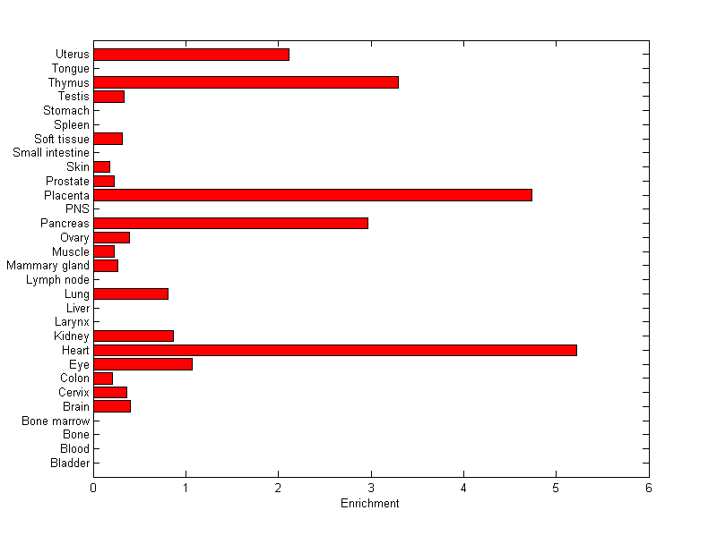 The expression level is normalized with tissue-library size. Each value for a gene in a tissue is a ratio of observed ESTs to the expected one in this tissue. The expected number of ESTs is the product of total ESTs of the gene and the fraction of total ESTs in the tissue among all ESTs in 30 tissues.
