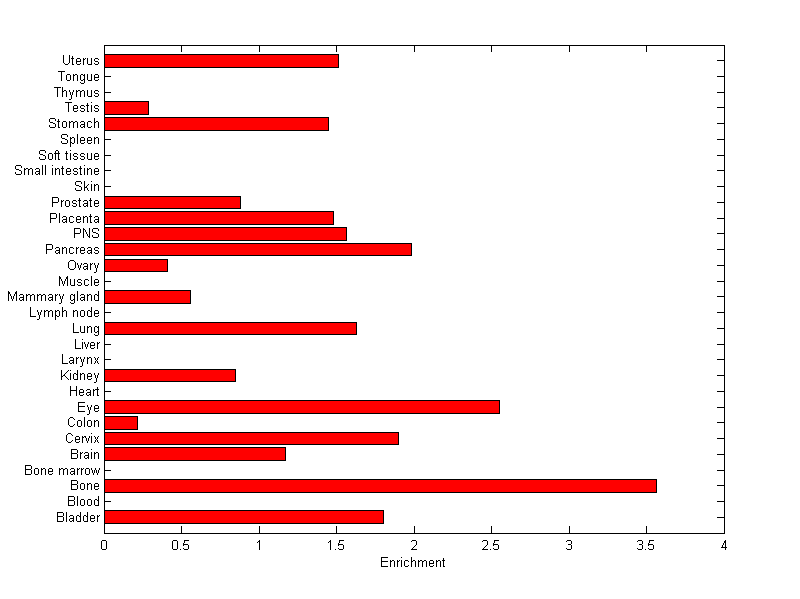 The expression level is normalized with tissue-library size. Each value for a gene in a tissue is a ratio of observed ESTs to the expected one in this tissue. The expected number of ESTs is the product of total ESTs of the gene and the fraction of total ESTs in the tissue among all ESTs in 30 tissues.