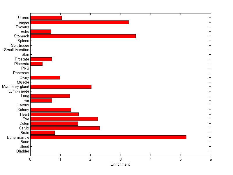 The expression level is normalized with tissue-library size. Each value for a gene in a tissue is a ratio of observed ESTs to the expected one in this tissue. The expected number of ESTs is the product of total ESTs of the gene and the fraction of total ESTs in the tissue among all ESTs in 30 tissues.