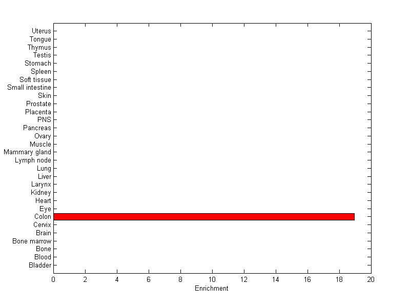 The expression level is normalized with tissue-library size. Each value for a gene in a tissue is a ratio of observed ESTs to the expected one in this tissue. The expected number of ESTs is the product of total ESTs of the gene and the fraction of total ESTs in the tissue among all ESTs in 30 tissues.