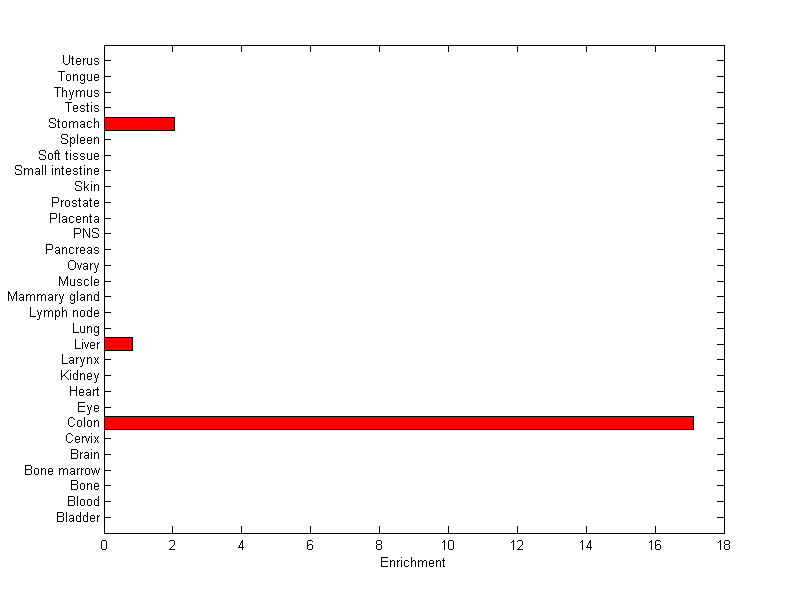 The expression level is normalized with tissue-library size. Each value for a gene in a tissue is a ratio of observed ESTs to the expected one in this tissue. The expected number of ESTs is the product of total ESTs of the gene and the fraction of total ESTs in the tissue among all ESTs in 30 tissues.