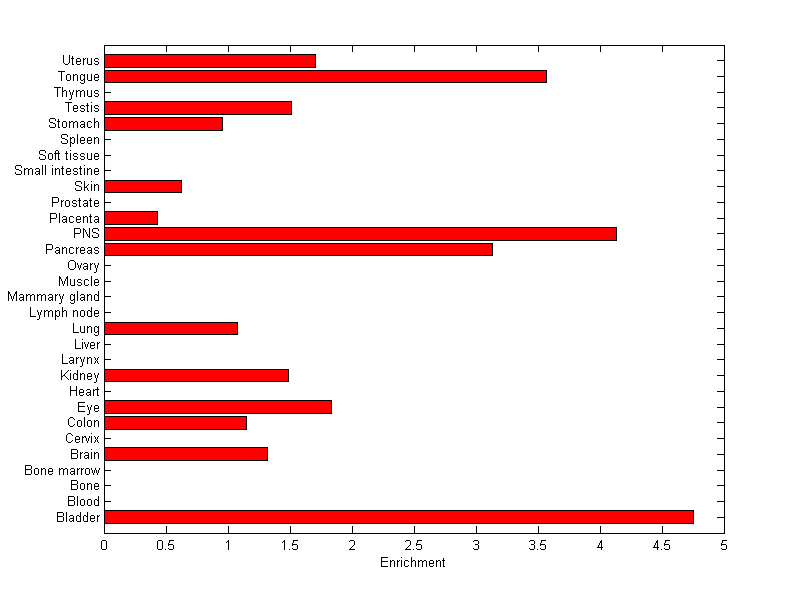 The expression level is normalized with tissue-library size. Each value for a gene in a tissue is a ratio of observed ESTs to the expected one in this tissue. The expected number of ESTs is the product of total ESTs of the gene and the fraction of total ESTs in the tissue among all ESTs in 30 tissues.