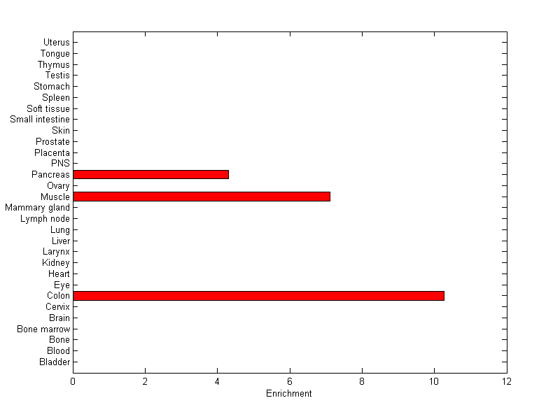 About the profile: The expression level is normalized with tissue-library size. Each value for a gene in a tissue is a ratio of observed ESTs to the expected one in this tissue. The expected number of ESTs is the product of total ESTs of the gene and the fraction of total ESTs in the tissue among all ESTs in 30 tissues. Summary: This gene is preferentially expressed in [colon] Download: |