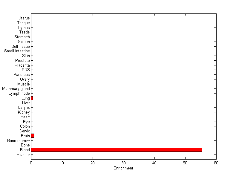 About the profile: The expression level is normalized with tissue-library size. Each value for a gene in a tissue is a ratio of observed ESTs to the expected one in this tissue. The expected number of ESTs is the product of total ESTs of the gene and the fraction of total ESTs in the tissue among all ESTs in 30 tissues. Summary: This gene is preferentially expressed in [blood] Download: |