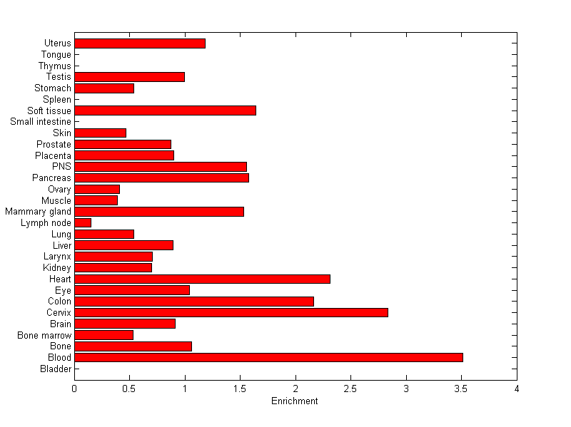 The expression level is normalized with tissue-library size. Each value for a gene in a tissue is a ratio of observed ESTs to the expected one in this tissue. The expected number of ESTs is the product of total ESTs of the gene and the fraction of total ESTs in the tissue among all ESTs in 30 tissues.