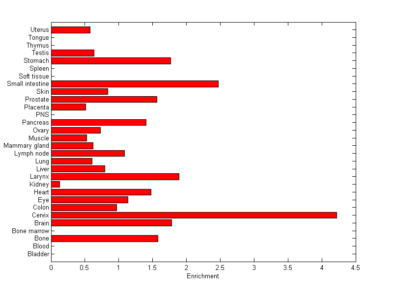 The expression level is normalized with tissue-library size. Each value for a gene in a tissue is a ratio of observed ESTs to the expected one in this tissue. The expected number of ESTs is the product of total ESTs of the gene and the fraction of total ESTs in the tissue among all ESTs in 30 tissues.