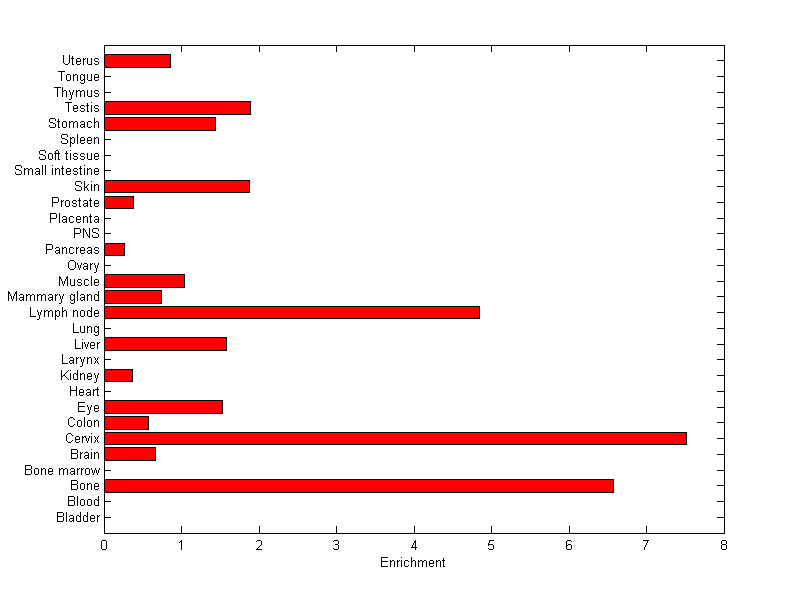 About the profile: The expression level is normalized with tissue-library size. Each value for a gene in a tissue is a ratio of observed ESTs to the expected one in this tissue. The expected number of ESTs is the product of total ESTs of the gene and the fraction of total ESTs in the tissue among all ESTs in 30 tissues. Summary: This gene is preferentially expressed in [bone, cervix] Download: |