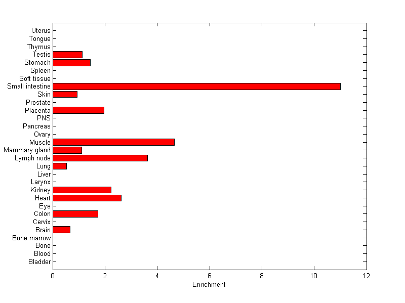 The expression level is normalized with tissue-library size. Each value for a gene in a tissue is a ratio of observed ESTs to the expected one in this tissue. The expected number of ESTs is the product of total ESTs of the gene and the fraction of total ESTs in the tissue among all ESTs in 30 tissues.