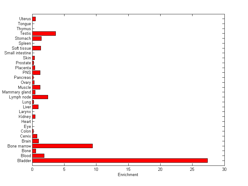The expression level is normalized with tissue-library size. Each value for a gene in a tissue is a ratio of observed ESTs to the expected one in this tissue. The expected number of ESTs is the product of total ESTs of the gene and the fraction of total ESTs in the tissue among all ESTs in 30 tissues.