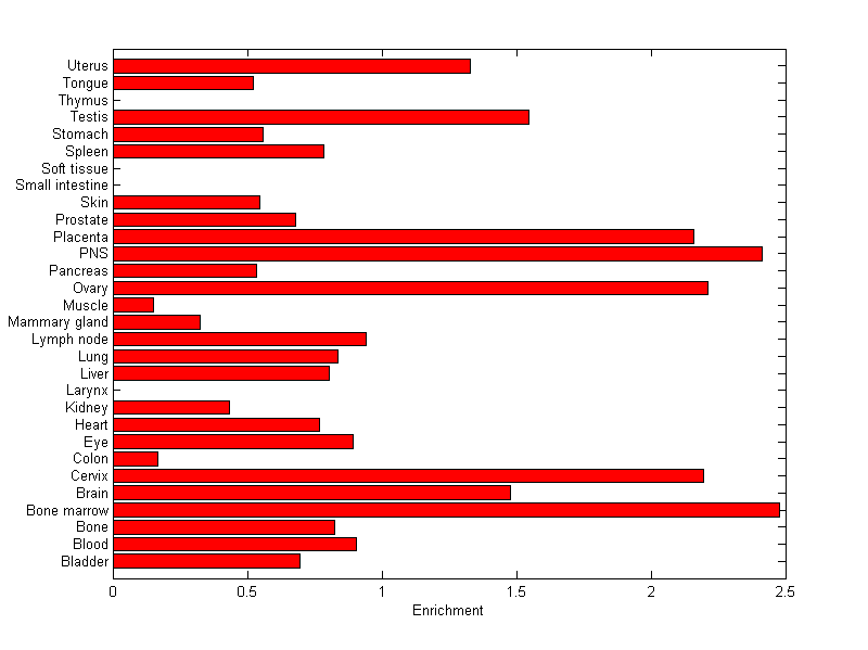 The expression level is normalized with tissue-library size. Each value for a gene in a tissue is a ratio of observed ESTs to the expected one in this tissue. The expected number of ESTs is the product of total ESTs of the gene and the fraction of total ESTs in the tissue among all ESTs in 30 tissues.