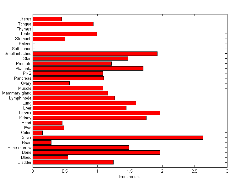 The expression level is normalized with tissue-library size. Each value for a gene in a tissue is a ratio of observed ESTs to the expected one in this tissue. The expected number of ESTs is the product of total ESTs of the gene and the fraction of total ESTs in the tissue among all ESTs in 30 tissues.