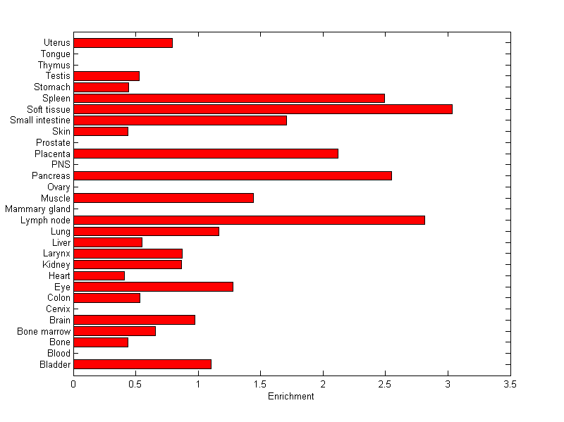 The expression level is normalized with tissue-library size. Each value for a gene in a tissue is a ratio of observed ESTs to the expected one in this tissue. The expected number of ESTs is the product of total ESTs of the gene and the fraction of total ESTs in the tissue among all ESTs in 30 tissues.