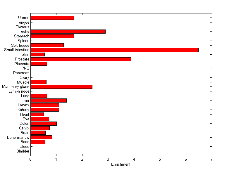 The expression level is normalized with tissue-library size. Each value for a gene in a tissue is a ratio of observed ESTs to the expected one in this tissue. The expected number of ESTs is the product of total ESTs of the gene and the fraction of total ESTs in the tissue among all ESTs in 30 tissues.