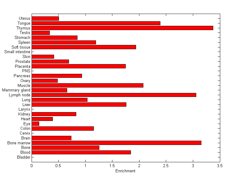 The expression level is normalized with tissue-library size. Each value for a gene in a tissue is a ratio of observed ESTs to the expected one in this tissue. The expected number of ESTs is the product of total ESTs of the gene and the fraction of total ESTs in the tissue among all ESTs in 30 tissues.