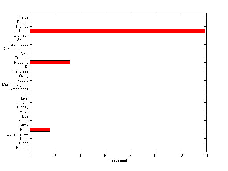 The expression level is normalized with tissue-library size. Each value for a gene in a tissue is a ratio of observed ESTs to the expected one in this tissue. The expected number of ESTs is the product of total ESTs of the gene and the fraction of total ESTs in the tissue among all ESTs in 30 tissues.