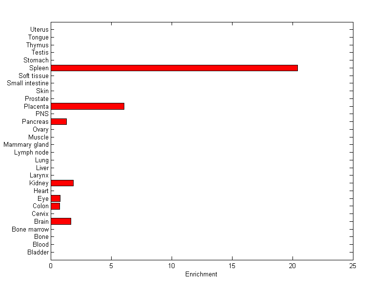 The expression level is normalized with tissue-library size. Each value for a gene in a tissue is a ratio of observed ESTs to the expected one in this tissue. The expected number of ESTs is the product of total ESTs of the gene and the fraction of total ESTs in the tissue among all ESTs in 30 tissues.