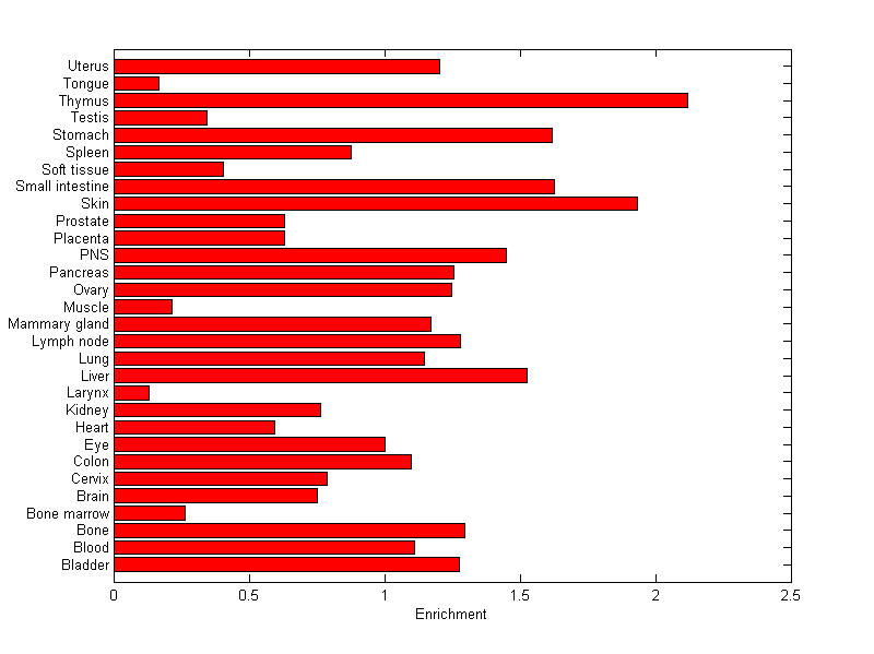 The expression level is normalized with tissue-library size. Each value for a gene in a tissue is a ratio of observed ESTs to the expected one in this tissue. The expected number of ESTs is the product of total ESTs of the gene and the fraction of total ESTs in the tissue among all ESTs in 30 tissues.