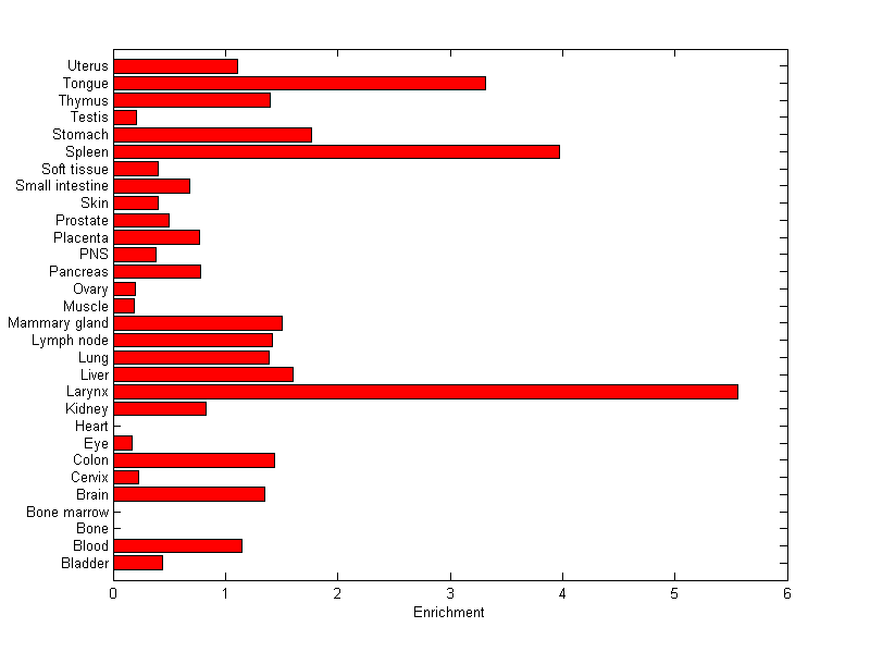 The expression level is normalized with tissue-library size. Each value for a gene in a tissue is a ratio of observed ESTs to the expected one in this tissue. The expected number of ESTs is the product of total ESTs of the gene and the fraction of total ESTs in the tissue among all ESTs in 30 tissues.