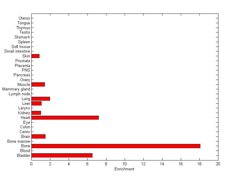 The expression level is normalized with tissue-library size. Each value for a gene in a tissue is a ratio of observed ESTs to the expected one in this tissue. The expected number of ESTs is the product of total ESTs of the gene and the fraction of total ESTs in the tissue among all ESTs in 30 tissues.
