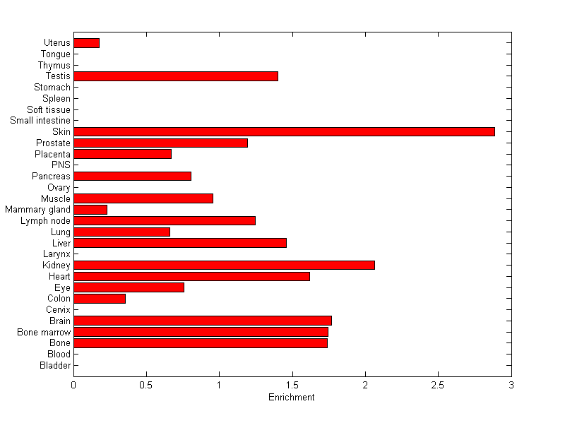 The expression level is normalized with tissue-library size. Each value for a gene in a tissue is a ratio of observed ESTs to the expected one in this tissue. The expected number of ESTs is the product of total ESTs of the gene and the fraction of total ESTs in the tissue among all ESTs in 30 tissues.