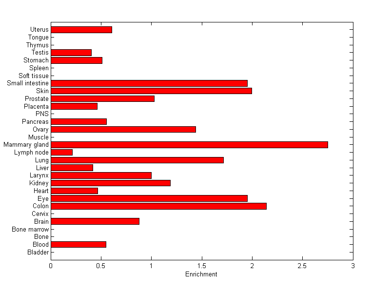 The expression level is normalized with tissue-library size. Each value for a gene in a tissue is a ratio of observed ESTs to the expected one in this tissue. The expected number of ESTs is the product of total ESTs of the gene and the fraction of total ESTs in the tissue among all ESTs in 30 tissues.