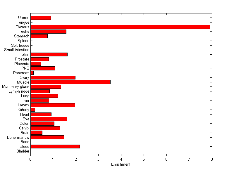 The expression level is normalized with tissue-library size. Each value for a gene in a tissue is a ratio of observed ESTs to the expected one in this tissue. The expected number of ESTs is the product of total ESTs of the gene and the fraction of total ESTs in the tissue among all ESTs in 30 tissues.