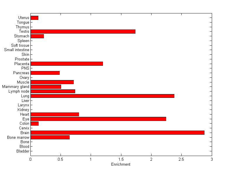 The expression level is normalized with tissue-library size. Each value for a gene in a tissue is a ratio of observed ESTs to the expected one in this tissue. The expected number of ESTs is the product of total ESTs of the gene and the fraction of total ESTs in the tissue among all ESTs in 30 tissues.