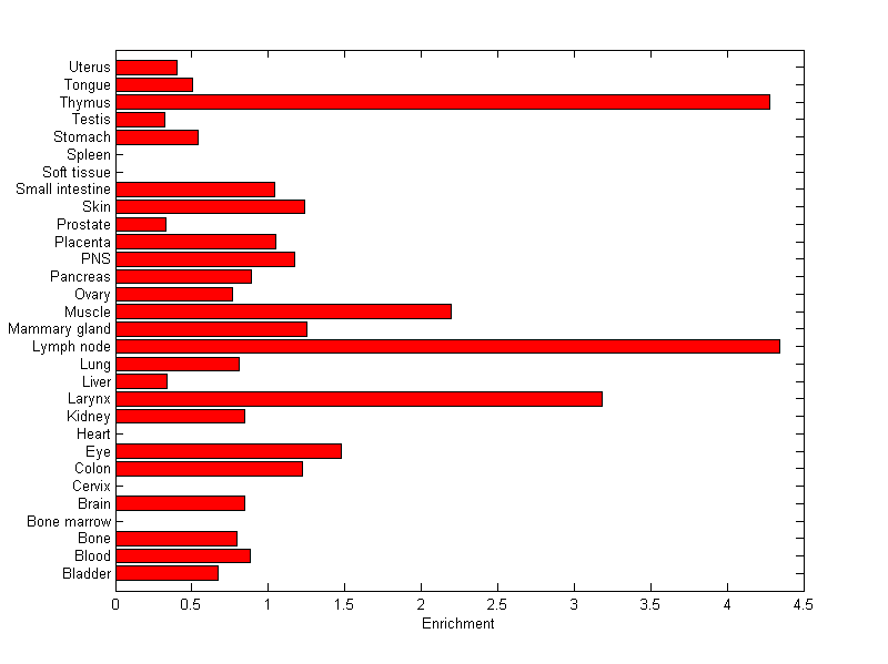 The expression level is normalized with tissue-library size. Each value for a gene in a tissue is a ratio of observed ESTs to the expected one in this tissue. The expected number of ESTs is the product of total ESTs of the gene and the fraction of total ESTs in the tissue among all ESTs in 30 tissues.