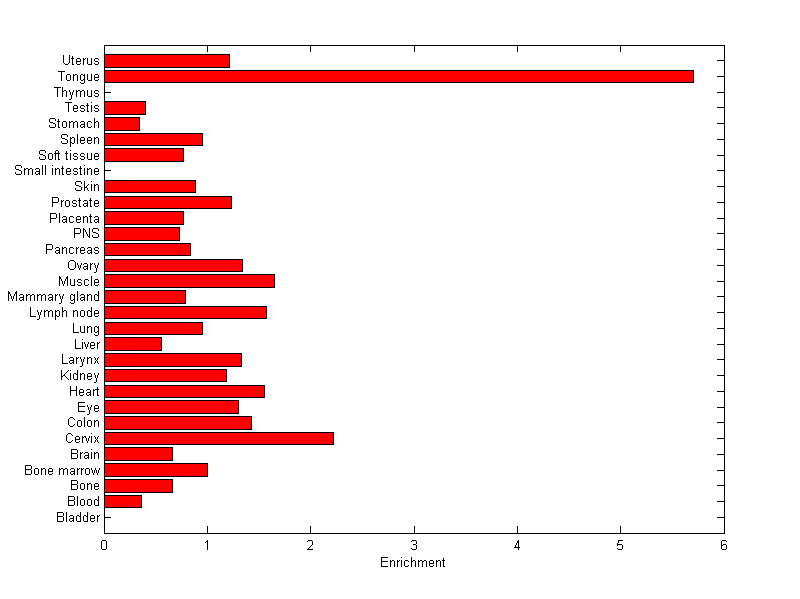 The expression level is normalized with tissue-library size. Each value for a gene in a tissue is a ratio of observed ESTs to the expected one in this tissue. The expected number of ESTs is the product of total ESTs of the gene and the fraction of total ESTs in the tissue among all ESTs in 30 tissues.