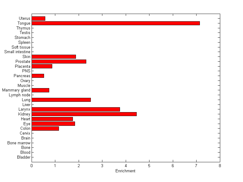 The expression level is normalized with tissue-library size. Each value for a gene in a tissue is a ratio of observed ESTs to the expected one in this tissue. The expected number of ESTs is the product of total ESTs of the gene and the fraction of total ESTs in the tissue among all ESTs in 30 tissues.