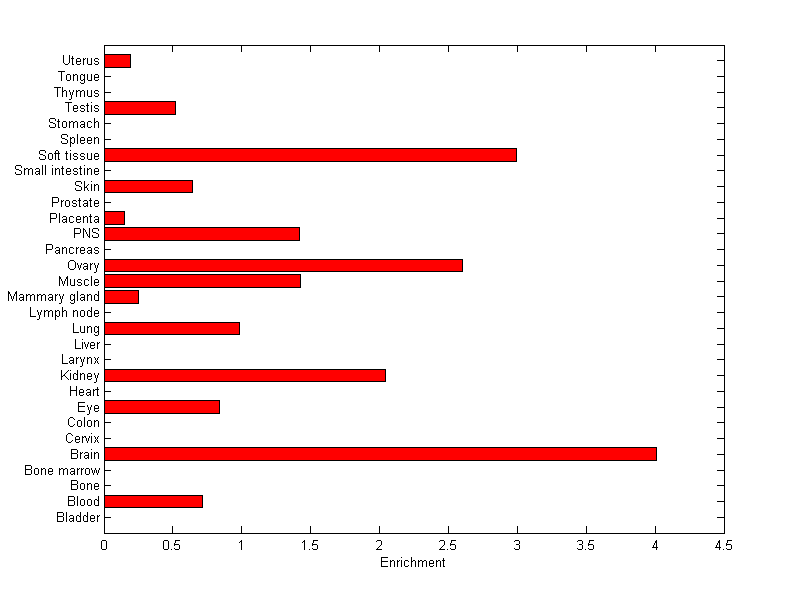 The expression level is normalized with tissue-library size. Each value for a gene in a tissue is a ratio of observed ESTs to the expected one in this tissue. The expected number of ESTs is the product of total ESTs of the gene and the fraction of total ESTs in the tissue among all ESTs in 30 tissues.