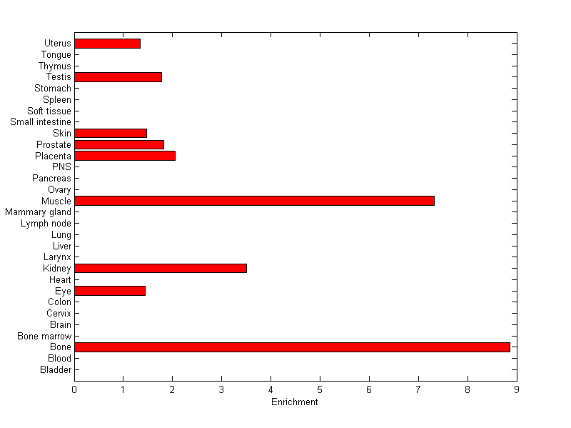 The expression level is normalized with tissue-library size. Each value for a gene in a tissue is a ratio of observed ESTs to the expected one in this tissue. The expected number of ESTs is the product of total ESTs of the gene and the fraction of total ESTs in the tissue among all ESTs in 30 tissues.