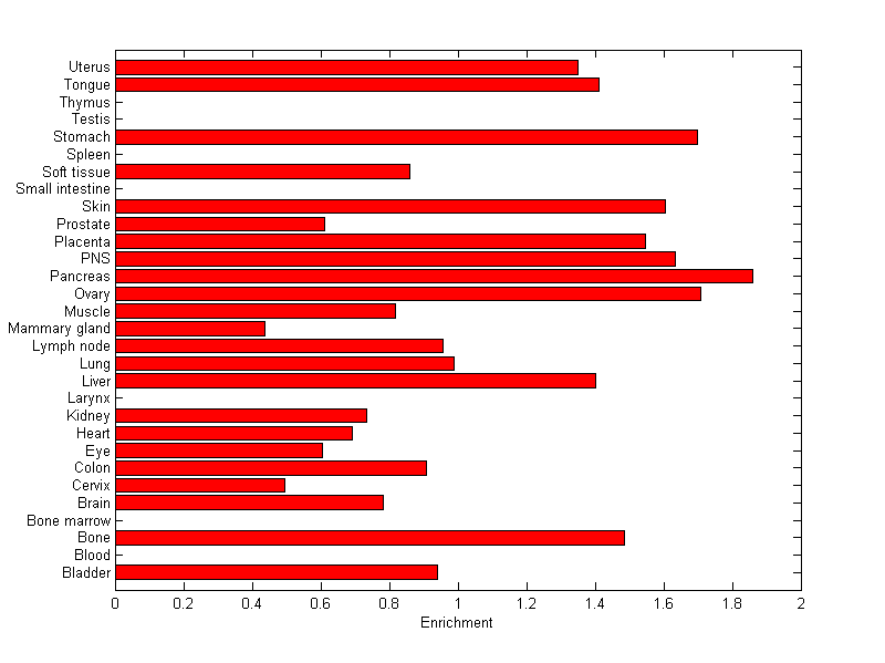 The expression level is normalized with tissue-library size. Each value for a gene in a tissue is a ratio of observed ESTs to the expected one in this tissue. The expected number of ESTs is the product of total ESTs of the gene and the fraction of total ESTs in the tissue among all ESTs in 30 tissues.