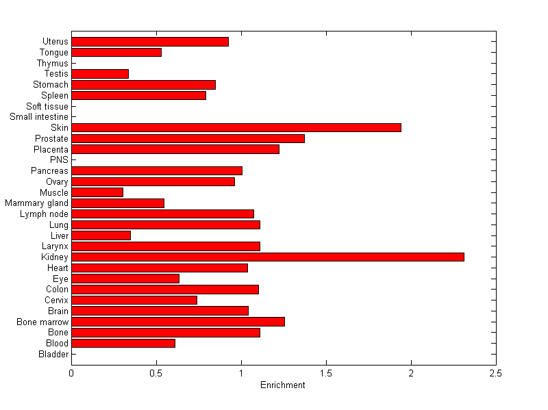 The expression level is normalized with tissue-library size. Each value for a gene in a tissue is a ratio of observed ESTs to the expected one in this tissue. The expected number of ESTs is the product of total ESTs of the gene and the fraction of total ESTs in the tissue among all ESTs in 30 tissues.