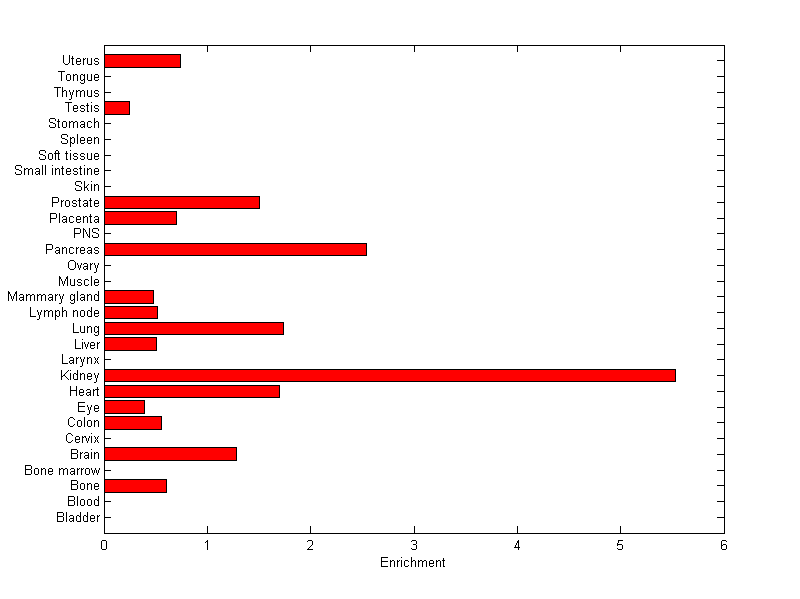 The expression level is normalized with tissue-library size. Each value for a gene in a tissue is a ratio of observed ESTs to the expected one in this tissue. The expected number of ESTs is the product of total ESTs of the gene and the fraction of total ESTs in the tissue among all ESTs in 30 tissues.