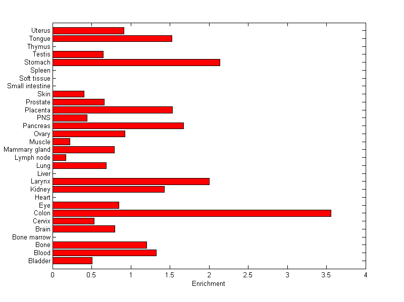 The expression level is normalized with tissue-library size. Each value for a gene in a tissue is a ratio of observed ESTs to the expected one in this tissue. The expected number of ESTs is the product of total ESTs of the gene and the fraction of total ESTs in the tissue among all ESTs in 30 tissues.