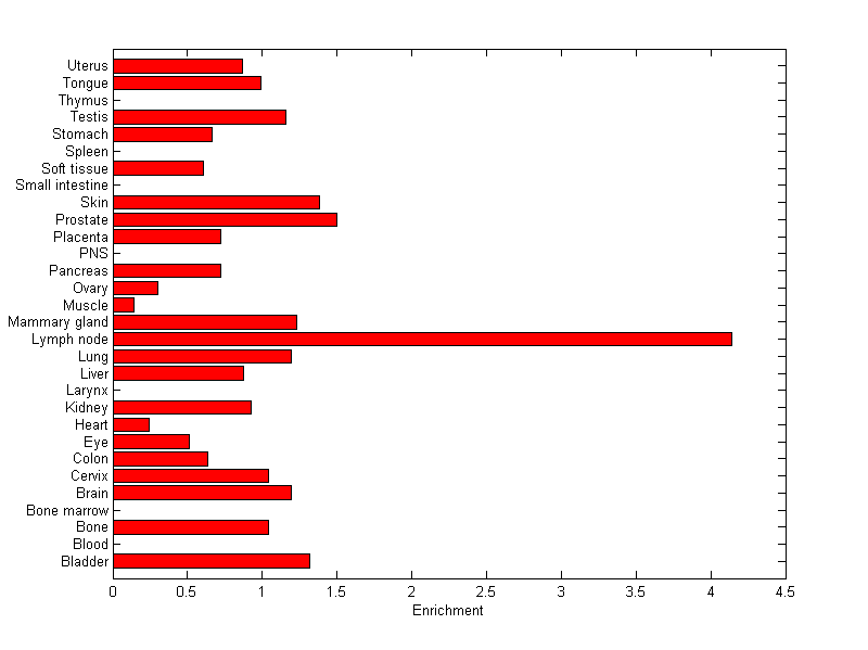 The expression level is normalized with tissue-library size. Each value for a gene in a tissue is a ratio of observed ESTs to the expected one in this tissue. The expected number of ESTs is the product of total ESTs of the gene and the fraction of total ESTs in the tissue among all ESTs in 30 tissues.