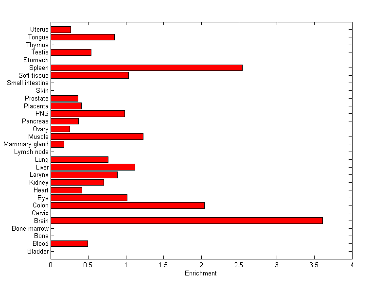 The expression level is normalized with tissue-library size. Each value for a gene in a tissue is a ratio of observed ESTs to the expected one in this tissue. The expected number of ESTs is the product of total ESTs of the gene and the fraction of total ESTs in the tissue among all ESTs in 30 tissues.