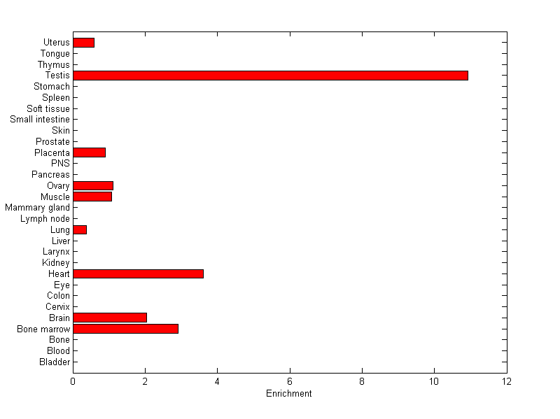 The expression level is normalized with tissue-library size. Each value for a gene in a tissue is a ratio of observed ESTs to the expected one in this tissue. The expected number of ESTs is the product of total ESTs of the gene and the fraction of total ESTs in the tissue among all ESTs in 30 tissues.