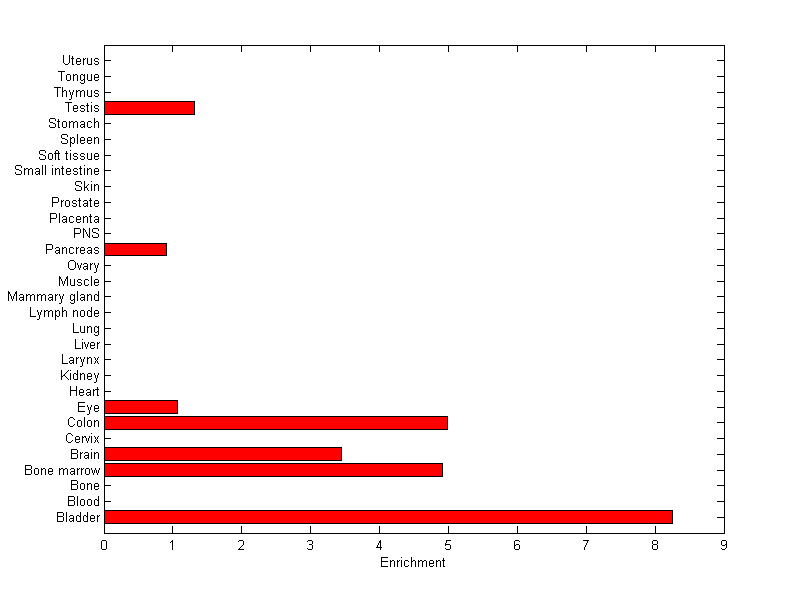 The expression level is normalized with tissue-library size. Each value for a gene in a tissue is a ratio of observed ESTs to the expected one in this tissue. The expected number of ESTs is the product of total ESTs of the gene and the fraction of total ESTs in the tissue among all ESTs in 30 tissues.