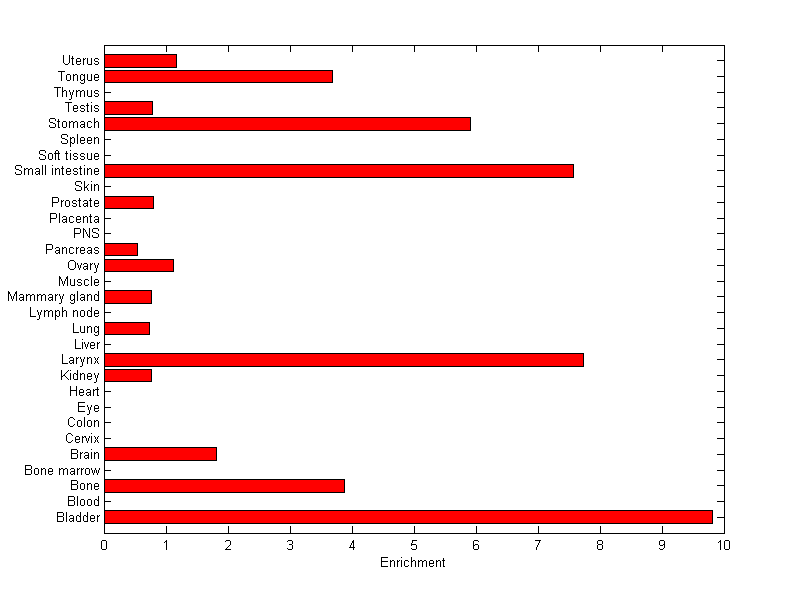 The expression level is normalized with tissue-library size. Each value for a gene in a tissue is a ratio of observed ESTs to the expected one in this tissue. The expected number of ESTs is the product of total ESTs of the gene and the fraction of total ESTs in the tissue among all ESTs in 30 tissues.
