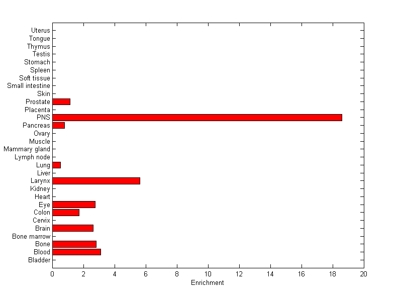 The expression level is normalized with tissue-library size. Each value for a gene in a tissue is a ratio of observed ESTs to the expected one in this tissue. The expected number of ESTs is the product of total ESTs of the gene and the fraction of total ESTs in the tissue among all ESTs in 30 tissues.
