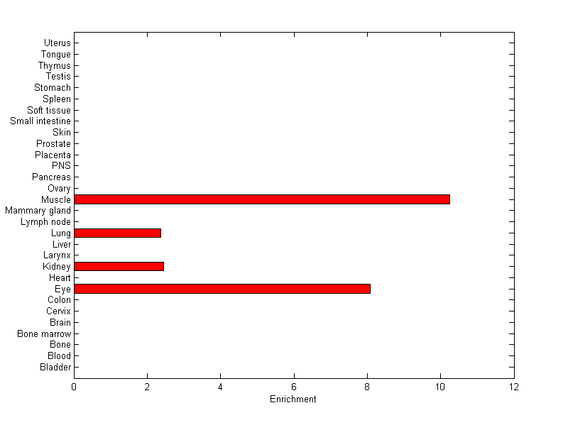 The expression level is normalized with tissue-library size. Each value for a gene in a tissue is a ratio of observed ESTs to the expected one in this tissue. The expected number of ESTs is the product of total ESTs of the gene and the fraction of total ESTs in the tissue among all ESTs in 30 tissues.