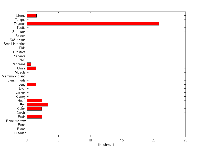 The expression level is normalized with tissue-library size. Each value for a gene in a tissue is a ratio of observed ESTs to the expected one in this tissue. The expected number of ESTs is the product of total ESTs of the gene and the fraction of total ESTs in the tissue among all ESTs in 30 tissues.