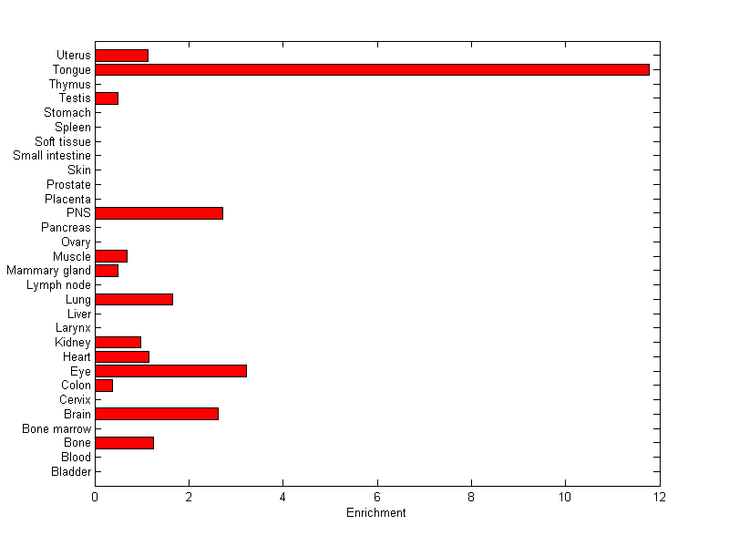 The expression level is normalized with tissue-library size. Each value for a gene in a tissue is a ratio of observed ESTs to the expected one in this tissue. The expected number of ESTs is the product of total ESTs of the gene and the fraction of total ESTs in the tissue among all ESTs in 30 tissues.
