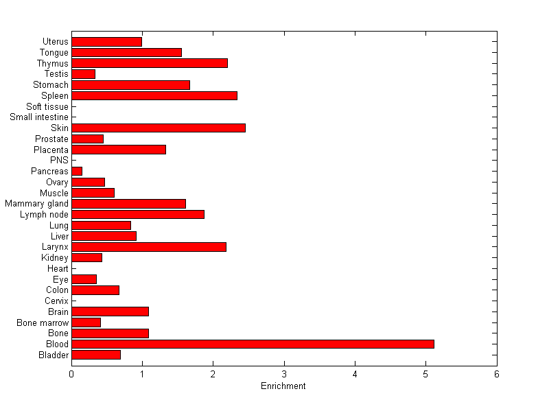The expression level is normalized with tissue-library size. Each value for a gene in a tissue is a ratio of observed ESTs to the expected one in this tissue. The expected number of ESTs is the product of total ESTs of the gene and the fraction of total ESTs in the tissue among all ESTs in 30 tissues.